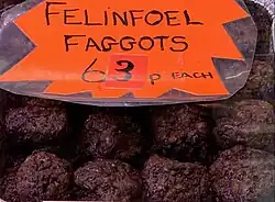 Carmarthen Market also sells home-made brawn, sausages, pork pies, and faggots.[1] Faggots can be bought at Ettie Richardson's Home Baking stall, which sells them fresh every Wednesday, Friday and Saturday.[3] A & G Williams of Felinfoel produce traditional Welsh faggots and other savoury products.[8] Brawn is a traditional Carmarthenshire dish, and one Carmarthenshire recipe includes pig's head and trotters which are rubbed well with salt and then placed in a crock and left for 2 or 3 days. The meat is then washed in cold water, placed in a boiler pan, brought to the boil and then simmered for 3–4 hours until the meat leaves the bone. The meat is then minced with onions, sage and pepper and then, the liquor strained, and then the mixture simmered for about 15 minutes and then left to cool.[16]