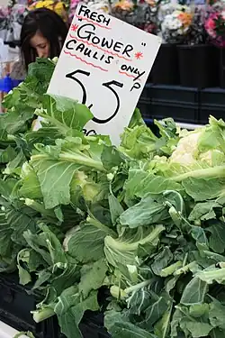 The combination of geology and climate means that Gower is well known for its root, and other, vegetables. These include potatoes, cauliflower, and swedes.[3] In the case of cauliflower, a frost-free climate is required when the curd is developing. The area around Rhossili is an important supply area. Thousands of cases of cauliflowers are transported from here to shops nationwide during the winter months.[3] Local farmers' markets and Swansea Market sell fresh Gower vegetables, as do farms such as Nicholaston Farm, owned by the Beynon family, which supplies asparagus, beans, and peas.[4]