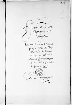 In addition, Gilles de Rais is depicted as beardless, with medium-length hair and "dressed in an anachronistic Renaissance costume"[11] in two miniatures depicting his trial and execution respectively. The first miniature adorns a copy of the ecclesiastical trial, and the second a copy of the civil trial. Stamped with the Bouhier family coat of arms, the two illuminations and their manuscript supports were once kept by the jurist and historian Jean Bouhier, president at the parlement of Dijon. Partly inherited from his grandfather,[12] President Bouhier's collection of manuscript compilations was part of the scholarly tradition, in the 17th and 18th centuries, of assembling copies of trials relating to crimes of lèse-majesté as examples of the legal condemnations meted out to the nobility.[13][14]
