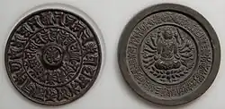 The backs of a pair of bronze mirrors showing Cundi, one with a Sanskrit inscription in Ranjana script, and one with a Sanskrit inscription in Chinese script. Yuan dynasty (1271–1368). Held at the Capital Museum, Beijing.
