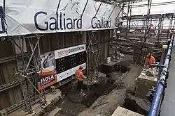 In May 2016, excavators announced that the theatre was probably an adaptation of an existing structure, in the form of a rectangle measuring 22×25 metres, rather than being round or polygonal.[3] Walls survived up to 1.5 metres (5 ft) high in places; MOLA identified the courtyard, where theatregoers stood, and the inner walls, which held the galleries.[19] The theatre had timber galleries with mid and upper areas for wealthier audience members, and a courtyard made from compacted gravel for those with less to spend.[20] The galleries were straight.[3]