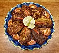 In Iran, cutlet (Persian: کُتلت), (Shirazi Persian: کاتلت) is a popular hamburger-like thin layered mixture of fried ground beef or lamb or sometimes chicken, mashed or grated potatoes, eggs, onions, spices, shaped like a flower leaf, with a thin layer of wheat flour for coating; which is deep fried, usually served with tomato, onion, parsley and bread.