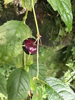 Its fruit is a purple-black berry 5–10 mm (0.20–0.39 in) in diameter with numerous seeds.[2] The seeds are elliptic and flattened.[3]