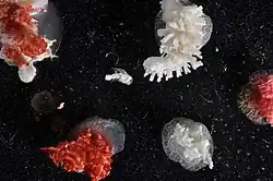 Polymorphism of zooids is less conspicuous than in cheilostomes. However, almost all cyclostome species have enlarged zooids - gonozooids - for brooding larvae, and some species also possess non-feeding zooids - kenozooids - with space-filling and structural roles. Modern cyclostomes exhibit polyembryony: fertilized ova divide to produce multiple, genetically identical larvae which are housed in the spacious gonozooid before being released, swimming for a short period before settling and undergoing metamorphosis to establish new clonal colonies. Gonozooids are also very important in the taxonomy of cyclostomes, particularly in the largest suborder the Tubuliporina. Unfortunately, not all colonies develop gonozooids and infertile colonies may be difficult to identify even to family-level.