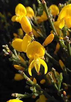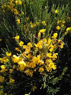 It is composed of dense, tightly packed branches. Forms extensive shrublands, alone or coexisting with other shrubs, such as the creeping juniper (Juniperus communis subsp. nana) in the high siliceous mountains, and almost always above forest level or coexisting with Scot pines. The leaves fall early so the stems are often bare; the lower ones are trifoliate, without petiole; the floral ones are simple and also seated. Flowers yellow, small, (9–12 mm) single or in pairs in the axil of the leaves, forming a more or less dense cluster at the termination of the branches supported by a 2–6 mm head. Calyx membranous, bell-shaped and hairy. The corolla is butterfly-like, with a rounded upper petal. The fruit is a legume of 15 to 30 mm, straight or somewhat curved, very compressed laterally and covered with hairs applied to its surface. It flowers from May to July.[2]