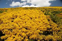 Cytisus oromediterraneus dominates the vegetation of the oromediterranean floor in Gredos, it can cover the highest north-facing slopes of the supramediterranean; in fact, from some points of Gredos, such as the road leading to the platform, it can be clearly seen how the north-facing slopes are covered by the Pyrenean broom, while those facing south are inhabited by the hiniesta and/or the white broom. In the coexistence zone between the Pyrenean broom and the white broom it is possible to find individuals with very light yellow flowers that are interpreted as hybrids between the two species. Finally, in the western, most sectors of the Central system, two other very thorny shrubby fabaceae, whose optimum is in the oromediterranean together with the Pyrenean broom, can appear on the north-facing supramediterranean slopes, the common broom (Echinospartum barnadesii) and the Iberian broom (Echinospartun ibericum).[3] The clearings of piornales are mainly occupied by various herbs and shrubs, among which we highlight the attractive viborera salmantina (Echium salmanticum).
