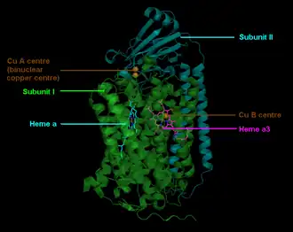 The complex is a large integral membrane protein composed of several metal prosthetic sites and 13[2] protein subunits in mammals. In mammals, ten subunits are nuclear in origin, and three are synthesized in the mitochondria. The complex contains two hemes, a cytochrome a and cytochrome a3, and two copper centers, the CuA and CuB centers.[3] In fact, the cytochrome a3 and CuB form a binuclear center that is the site of oxygen reduction. Cytochrome c, which is reduced by the preceding component of the respiratory chain (cytochrome bc1 complex, Complex III), docks near the CuA binuclear center and passes an electron to it, being oxidized back to cytochrome c containing Fe3+. The reduced CuA binuclear center now passes an electron on to cytochrome a, which in turn passes an electron on to the cytochrome a3>-CuB binuclear center. The two metal ions in this binuclear center are 4.5 Å apart and coordinate a hydroxide ion in the fully oxidized state.