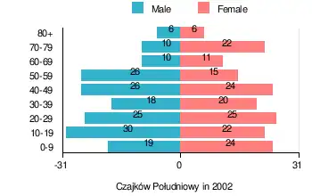 According to the 2002 Poland census, there were 339 people residing in Czajków Południowy village, of whom 50.1% were male and 49.9% were female. In the village, the population was spread out, with 25.7% under the age of 18, 36.6% from 18 to 44, 19.5% from 45 to 64, and 18.3% who were 65 years of age or older.[1]