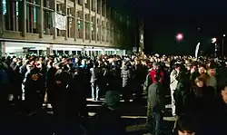 Following the "technical fault" screens and prevention of the news broadcasts by Bobošíková tens of thousands of people marched in the streets of Prague and other Czech cities and towns, calling for restoration of freedom of the press, demanding an end to what they perceived as censorship at ČT.[1] The demonstrations even drew support from the International Federation of Journalists and made world headlines.[1][4] The demonstrators also demanded Bobošíková's resignation and the dismissal of the allegedly biased general manager Jiří Hodač. Hodač was even briefly hospitalized during the events.[5]