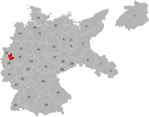 It comprised the eastern part of the Regierungsbezirk Düsseldorf in the Prussian Rhine Province, stretching between the cities of Essen, Düsseldorf, Wuppertal, and Leverkusen. It was constituency 22 in the numbering scheme.[1]