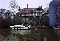 Carte intended to use the island as a special secluded annexe, accessible by boat, to his new Savoy Hotel, but a panel of local magistrates refused to grant him an alcoholic drinks licence for the property.[5] Instead, Carte had a 13-bedroom mansion, Eyot House, built on the island; it was completed in 1898,[6] and it became one of his main residences.[7][8] Among the famous guests who stayed at the house were the dramatist W. S. Gilbert and the composer Arthur Sullivan.[9] In later years, Carte displayed his macabre sense of humour by keeping a crocodile on the island.[10]