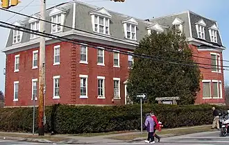 D'Youville Academy is a historic school building and nunnery in Plattsburgh in Clinton County, New York. It was built about 1878 and is a 2+12-story, cruciform plan brick structure on a raised stone foundation. The facade features a rounded 2-story bay, a five-gable roof dormer, and Mansard roof. The Academy was founded about 1878 and operated by the Grey Nuns, founded by Saint Marie-Marguerite d'Youville (1701-1771).[2] The Academy has since been folded into the Seton Catholic Central High School, and the building has since been converted into apartments.