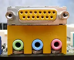 Female DE-15 connector (socket), used for VGA, SVGA and XGA ports. It is blue per to the PC System Design Guides color-coding scheme.