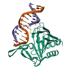 - Base-flipping: AlkB flip their target base out of the double-stranded DNA helix into their catalytic pocket. This is done by a base-flipping mechanism where AlkB uses a short "pinch" to squeeze together the two flanking bases such that they stack onto one another.[2]