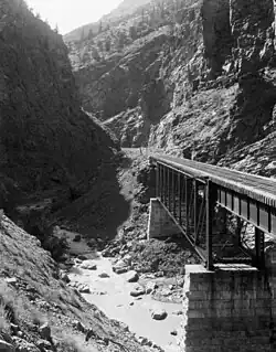 The Pratt Truss-style bridge was constructed in 1895 by the Denver and Rio Grande Railroad, as part of the railroad's narrow gauge passenger and freight route between Gunnison and Montrose in Western Colorado.[2] Crossing the turbulent Cimarron River just upstream from its confluence with the Gunnison River, the trestle replaced a wooden trestle built during the route's construction in 1882. Originally 288 feet (88 m) long, only the central span of it remains today. [3] The last remaining Trestle on the route after the abandonment of the line in the 1950s and the inundation of the Gunnison in the 1960s, the structure was listed on the National Register of Historic Places in 1976.