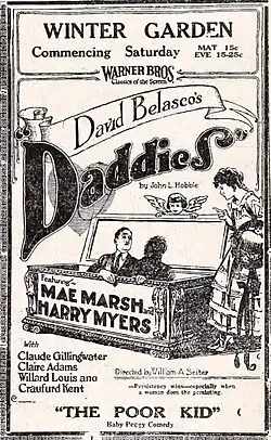 Daddies is a 1924 American silent romantic comedy film produced and distributed by Warner Bros. and directed by William A. Seiter. The film stars Mae Marsh and Harry Myers and survives today in 16mm format.[2] It was transferred onto 16mm film by Associated Artists Productions / United Artists[3] in the 1950s and shown on television.