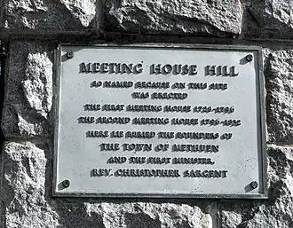 The cemetery site was known from an early date as "Meeting House Hill", because it was here that the townspeople erected the first Meeting House in 1728, and the second in 1798. This building was removed in 1832, and replaced by the present stone church in 1855, which retains some of the timbers from the 1796 structure. Afterward the hill became more commonly known as Daddy Frye's Hill, for Jeremiah Frye, who kept a large tavern on the northwest corner of the intersection of East and Brook Streets.[3] The town founders and its first minister, the Reverend Christopher Sargent are all buried here.