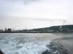 The community benefits from its geography by having a deep sea port, which is ice-free year round.[11] The administration of the port was privatised in 2006, as the result of the federal government's divestiture programme.[12] The port is located on the south shore of the Bay of Chaleur at the mouth of the Restigouche River, and includes 98 acres (40 hectares) of land, 494 acres (200 hectares) of "waterlot," and two cargo facilities—East Bay Marine Terminal, whose chief cargo is paper, and the West Wharf, which imports petroleum and coal and exports ore concentrates. Berth depths range from 9.7 to 10.3 meters (32 to 34 ft).[13] The port is located adjacent to the now-demolished pulp and paper mill. The east wharf can handle 340m vessels with maximum draught at low tide of 9.1m, and has indoor storage facilities of 1ha, while the west wharf handles vessels of up to 355m with draught 10.3m.[14]