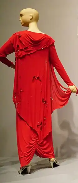 Rhodes created handmade evening wear using her unique feminine textiles. Each garment created incorporates different types of feminine style into place. She made her biggest splash in 1977 with the establishment take on punk, which she called Conceptual Chic.[11][12] She created dresses with holes and beaded safety pins – 10 years before Versace – to form a sort of embroidery, mixed with loosely drawn figures screen-printed on silk jersey, or on the newly developed Ultra suede fabric.[8] When she creates her garments a lot of thought goes into the construction. Simplistic shapes help mould the foundation of Rhodes's garments. The foundation of the shapes, functions as an enhancer that maximizes the effects of her prints. She achieves this look by using techniques including layering, smocking, and shirring.[6] All of Zandra Rhodes's garments are constructed around the design of her distinct prints, despite being structured around the formation of the dress.[9]