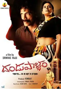Dandupalya is a 2012 Indian Kannada-language crime film directed by Srinivas Raju and starring Pooja Gandhi, Ravi Kale, Makarand Deshpande, P. Ravishankar and Raghu Mukherjee. The plot is based on the real-life exploits of a notorious gang named Dandupalya. The film was a major commercial success and became one of the highest-grossing Kannada films at the time, being shown for more than 100-days in multiple centres.[3] With Gandhi in the lead, it turned out to be the highest grossing female lead film in Kannada cinema.