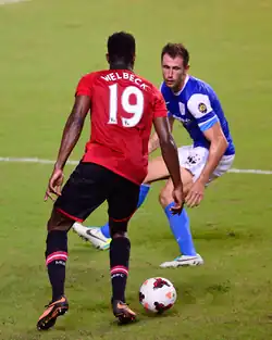 Welbeck was given a starting berth in the 2011 FA Community Shield match at Wembley Stadium on 7 August 2011.[30] United won the match 3–2, having trailed rivals Manchester City 2–0 at half time.[31] He started alongside Wayne Rooney in the first league match of the 2011–12 Premier League season away to West Bromwich Albion; he was substituted in the 65th minute, to be replaced by Dimitar Berbatov.[32] On 22 August, Welbeck scored the opening goal of the match against Tottenham Hotspur, heading in a cross from Tom Cleverley from nine yards to score in the 61st minute. He then provided an assist for Anderson in the 76th minute to make the score 2–0 before being substituted. The match ended in a 3–0 win for United.[33] Welbeck opened the scoring in an eventual 8–2 win over Arsenal. From outside the box, Anderson chipped the ball into Welbeck and he headed it over Wojciech Szczęsny.[34] However, Welbeck had to leave the field early with a pulled hamstring which, consequently, ruled him out for several weeks.[35]