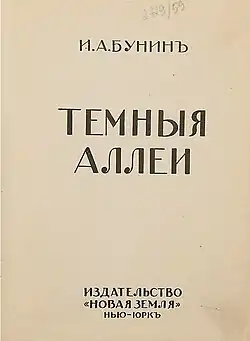 In 1942, when most of the European Russian emigres were hastily preparing to flee for America, Bunin with his wife, Vera Muromtseva, destitute as they were, decided to stay in France. Journalist Andrey Sedykh visited Bunin just before departing to the USA. As he was ready to leave the house, the writer said to him: "Last year I wrote Dark Alleys, a book about love. There it is, on the table. What am I to do with it here? Take it with you to America; who knows, may be you'll manage to publish it."[3][4] In 1943 600 copies of the book were printed by a small New York publishing company Novaya Zemlya (New Land).[5] Out of twenty stories Sedykh took with him only 11 were included: "Dark Alleys", "Caucasus", "The Ballad", "The Wall", "Muse", "Late Hour", "Rusia", "Tanya", "In Paris", "Natalie" and "April" (the last one later got excluded by the author from the second edition).[6]