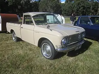 The 521 was the facelifted version of 520, with a so-called "flat-deck" style. This meant a flattened bonnet and front fenders as well as a new grille design.[17] It used the Nissan J engines (the previously mentioned J13 or the larger J15, rated at 77 hp) and later had a 70 kW (94 hp; 95 PS) Nissan L16 engine, always with a straight rear axle. The 520 strongly resembles a Datsun 410/411 from the front, since it shares most sheet metal with that car. The fender emblems said "Datsun 1300", "Datsun 1500" or "Datsun 1600" (depending on engine fitment). Van/delivery van (V521) and double cab (U521) versions were also available. It was manufactured from June 1968 until 1972, preceded by the 520 and followed by the 620. The 521 was the first compact half-ton pickup sold in the American market, in 1968.