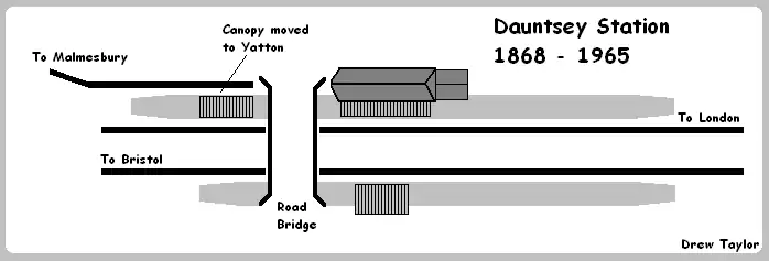 The station site is a mile and a half south of Dauntsey village and is near Dauntsey Lock which suggests that the station was important to the Wilts & Berks Canal. Dauntsey was a small station with three platforms, two of which are similar in length to the platforms at Corsham which is further down the line between Chippenham and Bath. The station had a main building with a canopy on the up platform (towards London) and the platform on the opposite side had a small brick shelter, also with a canopy.
