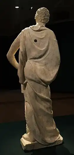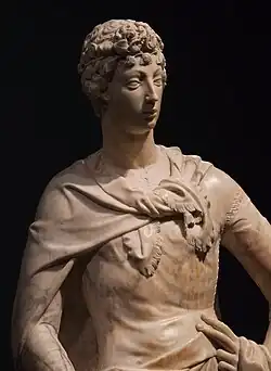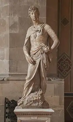 The marble piece is a work closely tied to tradition, revealing few signs of the innovative approach to representation that the artist would develop as he matured.[5] Although the positioning of the legs hints at a classical contrapposto, the figure holds a swaying Gothic posture that derives from Ghiberti's influence and is particularly representative of the International Style.[5] Alluding to ancient Greek heroism, the figure wears a crown of amaranth. In antiquity, amaranth was associated with Achilles and represented the "undying memory of heroes".[12]