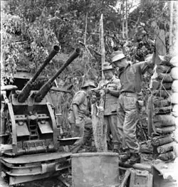 After El Alamein, Whitehead and his brigade returned to Australia in early 1943 to participate in operations against the Japanese. The 26th Brigade took part in the Landing at Lae in September 1943 and the Huon Peninsula campaign from October 1943 to January 1944.[10] Following these campaigns the brigade returned to Australia, and did not see action again until 1945. In May of that year Whitehead commanded the Australian landing at Tarakan. During this operation the 26th Brigade was expanded to almost the size of a division, and United States Army and Netherlands East Indies units served under Whitehead's command.[10] Whitehead relinquished command of the 26th Brigade on 10 December 1945, by which time the war had come to an end, and returned to Australia two days later.[9]