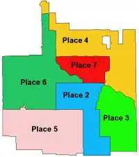 The city council consists of the mayor and six council members. The mayor represents the city as a whole and six council members represent particular districts (places) within the city. All are elected citywide for a term of three years with a limit of two terms.