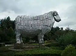 An aluminium sheep by artist Frank Darnley overlooks the mills, next to a similar sculpture representing a phoenix bird