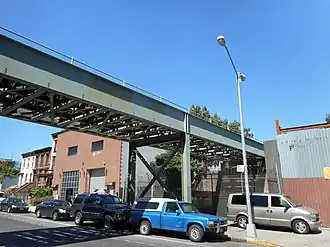The Kings County Elevated Railway was connected to the Brighton Beach Line in 1896 by means of a ramp and short elevated line from a point south of the latter railroad's terminal at Atlantic and Franklin Avenues in Brooklyn.[5][6] The local property owners were promised a station on the elevated structure near the old Bedford Terminal, and one was established by 1897 at Dean Street, nearly adjacent to the former terminal, which was closed. The station was not well patronized and the elevated company closed it c. 1899.[3] An uproar ensued, including appeals to the State Railroad Commission. By November 1899, one John Costello of Brooklyn had filed a complaint with the New York State Board of Railroad Commissioners.[7] On October 28, 1901, Dean Street was opened for the second time.[2]The station continued to be poorly patronized, as it was only a few hundred feet from the Franklin Avenue station, which was located at the busy intersection of Fulton Street and Franklin Avenue. Nevertheless, Dean Street was upgraded to handle six-car subway trains with the rest of the Franklin Avenue Line in 1924. However, through the 1970s and 1980s, the Dean Street station deteriorated, along with other stations on the line. In 1985, the station had only 133 paying daily riders (i.e., not counting farebeaters) on a typical weekday, making it one of the least used stations in the system.[8] In 1995, the New York City Transit Authority closed the station permanently as part of service cuts.[9] The TA cited low patronage (the lowest on the subway system), its decrepit condition, and its close proximity to Franklin Avenue station. At the time of its closing, Dean Street and Franklin Avenue were the two closest stations on the system, located just three blocks from each other at their closest points. It was charged that many who used Dean Street station jumped over the turnstiles, a major problem at the time, lowering the passenger count even further.[4]