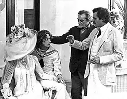 Photograph from the principal cinematography with Silvana Mangano (face not visible), Björn Andrésen, Luchino Visconti and Dirk Bogarde.