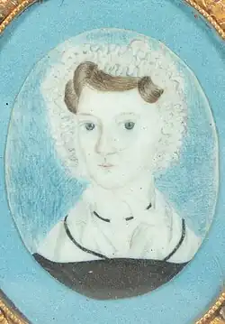 Goldsmith was a native of North Brookfield, New York, but spent much of her adolescence in the neighboring town of Hamilton, at the home of her sister and brother-in-law, the Boons.[2] She was the daughter of Richard and Ruth Miner Goldsmith, former residents of Guilford, Connecticut, who moved to Brookfield, New York, sometime between 1805 and 1808. Little is known of her life, or of her motivations for becoming an artist, although it is suspected that she was forced into the profession in order to support her parents.[3] Goldsmith has been described as a "self-taught itinerant limner".[4] No advertisements survive documenting her travels; however, her own records indicate that she was active in the New York communities of Brookfield, North Brookfield, Hamilton, Lebanon, Cooperstown, Hartwick, Toddsville, and Hubbardsville between 1826 and 1832. Most of her portraits were created between 1828 and 1832.[4] That year she married George Addison Throop, a member of a family for whom she had produced work; their marriage followed a correspondence in which she expressed concerns about their differing religions (she was a Baptist, he a Universalist), her age (greater by two years), and the fact that some of her teeth were false. The couple had two children before her death, following an illness of several weeks' duration.[5]