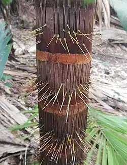 This species of palm tree has a distinctive spiny fruit, and produces yellow spines on the trunks of young specimens. Adults reach a height of 40 meters.