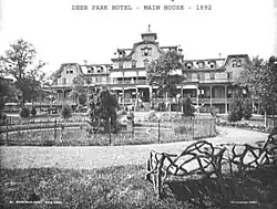The Deer Park Hotel was a vacation resort in the Appalachian Mountains of Western Maryland, in the small town of Deer Park, Maryland. Constructed in 1873 on land owned by a former Baltimore and Ohio Railroad (B&O) employee and West Virginia Senator Henry Gassaway Davis, the hotel was heavily promoted by the B&O railroad as cool and breeze-filled during otherwise hot city summers and 8 hours by express train from Baltimore and 11 hours by express train from Cincinnati, Ohio. It became a favorite resort for wealthy and prominent citizens of the Baltimore/Washington area. Presidents Ulysses S. Grant, Benjamin Harrison, and Grover Cleveland were among its guests; William McKinley visited the establishment before he became president. Even President Grover Cleveland spent his five-day honeymoon with his new wife, Frances Folsom Cleveland. The Deer Park Spring, which had produced pure mountain water that was sold commercially, supplied the hotel, its swimming pool, and Turkish baths. Deer Park's popularity declined after 1900 and the resort finally closed after the Depression began in 1929. The grand hotel itself was razed in 1944 due to a fire, although a few of the opulent cottages remain.