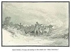 Suleiman's revolt was, however, short-lived. In 1878 and 1879 his forces were defeated by an Egyptian army under the Italian Romolo Gessi. The support of local Southern allies and their proxy forces led by the Zande king Tombura and Golo chief Kayongo played a key role in the war.[25] Suleiman surrendered, but was executed regardless. Gessi moved into his former residence and set up headquarters there.[23] One of his first steps was to disarm many of his own troops, who - by his own account - "were no less brutal and savage than Suleiman's troops."[26]