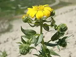 Deinandra halliana is an annual herb up to 120 cm (4 feet) tall. It produces numerous flower heads in an open array, each head containing 8-14 yellow ray florets and as many as 60 disc florets with yellow corollas but yellow or brown anthers.[3]