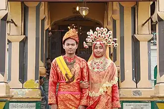 ![]() A bride and groom wearing traditional Deli Malays clothes. | |