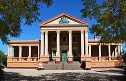 In 1843, the entrepreneur and speculator Benjamin Boyd acquired land in the vicinity of present-day Deniliquin (probably via his agent Augustus Morris). The location was then known by colonists as The Sandhills. Although there are several origin stories for the name Deniliquin, the most common suggests Boyd (or Morris) named it after 'Denilakoon', a local Indigenous Elder, famed for his wrestling prowess.[7] An inn and a punt were established on the site between 1845 and 1847; the town site was surveyed in 1848, and gazetted in 1850.[6] The original Native Police force of Frederick Walker was organised at Deniliquin in 1848. The Deniliquin Post Office opened on 1 January 1850.[8]