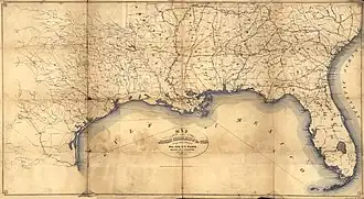 The department, frequently referred to as the Gulf District, was established on July 2, 1862, as a part of Department No. 2; its area was defined as the coast from the Pearl River to the Apalachicola River northward to latitude 32° north. On November 3, 1862,[3] the northern boundary was extended to latitude 33° north. On July 25, 1863, the department/district was transferred to the Department of Mississippi and Eastern Louisiana.[4] It remained in that department only until January 28, 1864, when it was transferred to the Department of Alabama and Eastern Mississippi.[4] Upon being transferred, the department/district boundaries were redefined as beginning at the mouth of the Pearl River, running north to latitude 32° north, east to the Georgia State line and south to the Gulf of Mexico.[4] On May 8, 1864, the boundary was again modified to define the eastern edge as being the intersection of latitude 32° north with a line running from the junction of the Coosa and Tallapoosa to point where the Choctawhatchee River entered Florida then following the Choctawhatchee to its mouth on the Gulf of Mexico.[4] The department/district surrendered on May 4, 1865.[4]