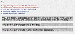 Players assume the role of a person suffering from depression, and the story centers on their daily life, including encounters at work and their relationship with their girlfriend. The story also features various treatments for depression.[4] Players are periodically faced with choices that alter the course of the story. To make a choice, the player must click on the corresponding hyperlink.[3] However, choices are often crossed out and cannot be clicked on, a mechanism that Depression Quest uses to portray the character's mental state and the fact that logical decisions may not be available to them.[5] Beneath the choices presented to the player are a set of statements about the character, indicating their level of depression, whether or not they are in therapy, and whether or not they are currently on medication.[7]
