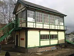 A crossing keeper's cottage, which survived the closure of the branch to become a private residence, matches the design of other minor stations along the route. The entrance to the booking hall and former platform door, now converted to be windows, can be seen and compared to contemporary station buildings.[10] However, contrary evidence suggests that the station may have been provided at the level crossing closer to the station, where there were later sidings on a section of line with a tight radius curve.[11]