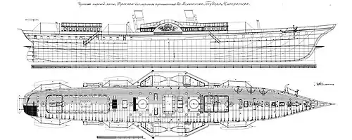 The deck of the Derzhava had two raised penthouses: the Emperor's in the back and the General Admiral's in the fore. The interiors of the imperial suites, furniture and tableware were designed by Ippolit Monighetti. The contract for the figurehead was awarded to Mikhail Mikeshin. Originally, Mikeshin proposed installing a female allegory of Russia wielding armor and the orb, the abstraction of the concept of the ship's name, but in 1867 Alexander dismissed the proposal and instructed Mikeshin to shape the standard double-headed eagle. Mikeshin made it by July 1870, yet his sculpture was radically different from the ordinary omnipresent state eagles.[1] On 11 May 1874, Derzhava ran aground at Vlissingen, Zeeland, Netherlands when leaving that port for Gravesend, Kent, United Kingdom. She was refloated on 13 May.[2][3] Derzhava ran aground again in late June 1879. She was on a voyage from Cronstadt to Copenhagen. She was refloated two days later and resumed her voyage, arriving at Copenhagen on 29 June.[4]