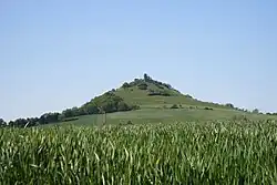 The Desenberg near Daseburg in the North Rhine-Westphalian county of Höxter is 343.6 m above sea level (NHN)[1] and the most prominent hill in the Warburg Börde, a relatively level, fertile Börde region. The hill is a basalt knoll crowned by the ruins of Desenberg Castle and a relict of recent geological history and volcanism, as well as medieval feudalism and warfare. The present shape of the Desenberg has arisen through weathering.