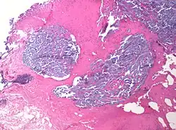 Desmoplastic small round cell tumour, with desmoplasia surrounding nests of cancer cells.