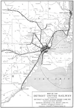The Detroit United Railway was a transport company which operated numerous streetcar and interurban lines in southeast Michigan. Although many of the lines were originally built by different companies, they were consolidated under the control of the Everett-Moore syndicate, a Cleveland-based group of investors. The company incorporated on December 31, 1900, and continued to expand into the early 1920s through new construction and the acquisition of smaller concerns. After the DUR acquired the Detroit-Jackson line in 1907, it operated more than 400 miles (640 km) of interurban lines and 187 miles (301 km) of street city street railway lines.