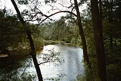 The village of Araluen lies in the valley of Araluen Creek, that joins the Deua River at roughly the midpoint in its course. The name 'Araluen' means 'water lily' or 'place of the water lilies' in the local aboriginal dialect.[6] At the time of European settlement Araluen was described as a broad alluvial valley with one or more large natural billabongs covered with water lilies, likely providing some unusual but important habitat for native fish and other aquatic fauna. Unfortunately, no such billabongs exist in the Araluen valley today. As with most river and creek valleys in south-eastern Australia, the natural landscape and landforms of Araluen Creek and its valley were destroyed by rampant and destructive gold mining, including via hydraulic sluicing, in the latter half of the 1800s. This has mobilised hundreds of thousands of tons of coarse granitic sand and has led to serious sand-slugging or sand siltation of the lower half of the Deua River below the Araluen Creek confluence.[3] New gold mines in the headwaters of the river remain controversial and have attracted considerable public attention for their proposed use of cyanide and breaches of environmental standards.