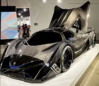 The Devel Sixteen is a mid-engine track-only concept sports car designed in the United Arab Emirates by Devel Motors. Devel Motors claims the V16 quad-turbo version of the car to be the fastest car in the world, with a claimed top speed of 348 mph (560 km/h) and a claimed 0–60 mph time of 1.8 seconds; its announced base version price is $1.7 million.[3]